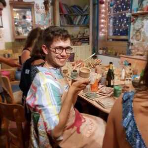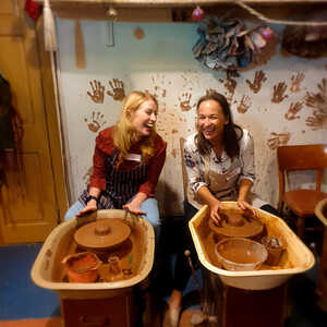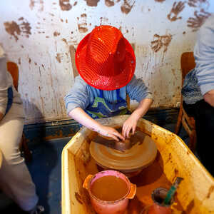 During a three hour group workshop you’ll arrive and get settled in, diving into the fancy dress box should the occasion call for it, and watch a demonstration of how to use the pottery wheels, tools and paints. An action packed experience of 100% pottering will follow, where you’ll take it in turns to throw a pot on one of our three wheels, as well as create tiles, sculpture or anything else that takes your fancy. Then you’ll paint the whole lot with bright colours, brushing, sponging and splattering to your heart’s content, all while listening to groovy music…something for big kids and little kids alike to look forward to!
